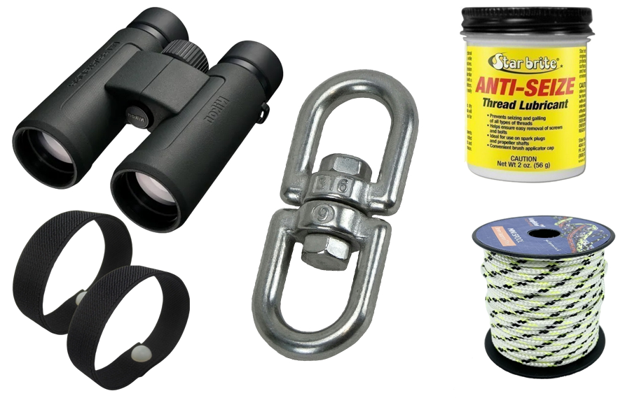 A variety of must-have accessories for boat owners, including binoculars, thread lubricants, sea sickness bands, eye hooks, and much more