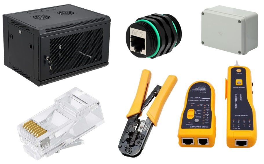 Includes connectors, junction boxes, server racks, crimping tools, cable testers, and everything needed for a professional setup